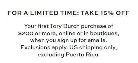 Zaregistrujte se pomocí e-mailu na ToryBurch.com a uchopte tuto akci a ušetřete 15% slevu na vaši první objednávku nad 200 USD při pokladně.